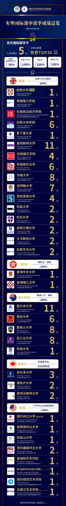世界TOP30录取率100%:录取总量同比激增300%,2025届毕业生人均斩获5封录取,每位学子均手握至少1封世界前30名校offer,实现全员顶尖院校录取。